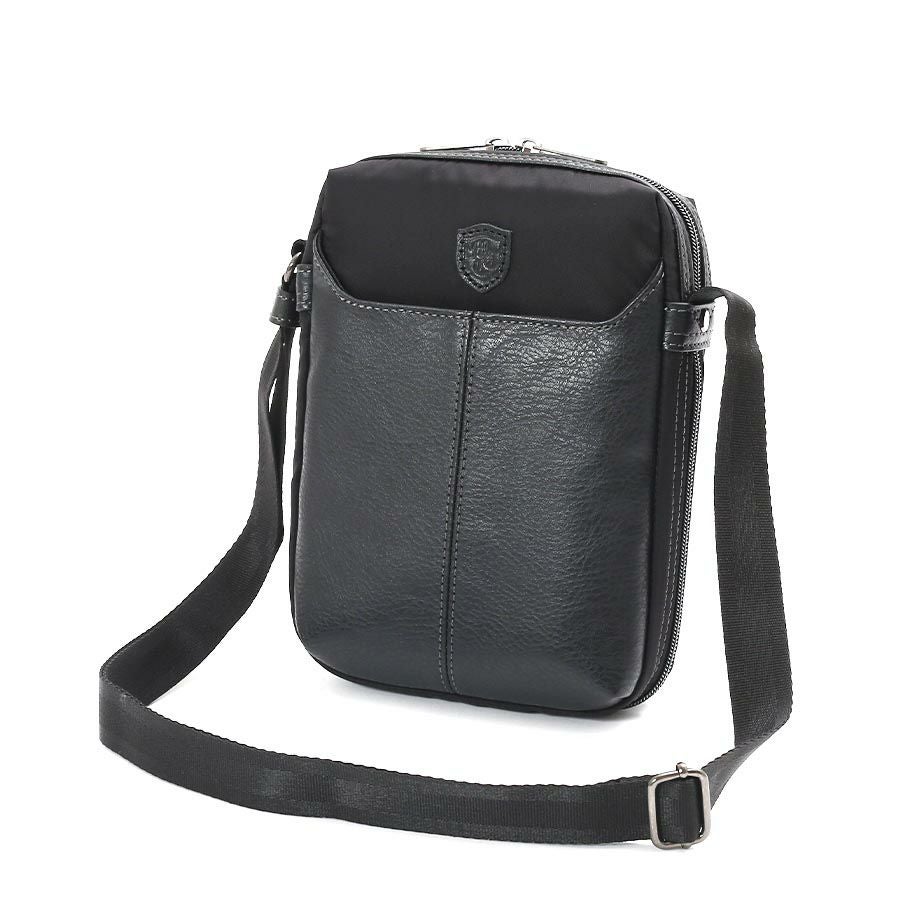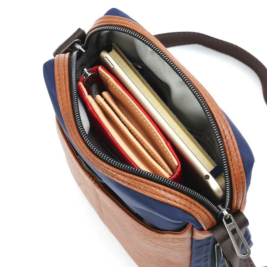 ◆ 高密度ナイロンツイルと合皮を素材コンビにした、シンプル表情のエキスパンダブルショルダーバッグ。